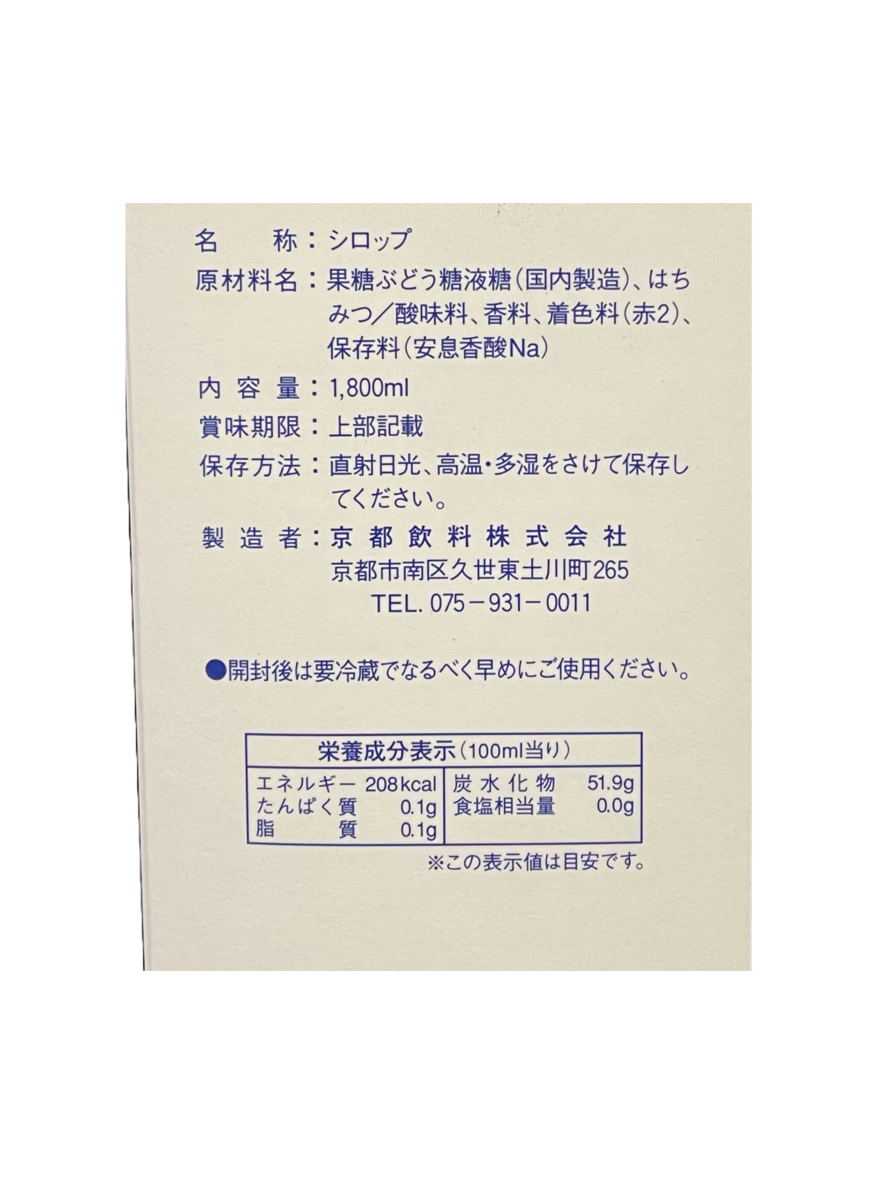 京都飲料 かき氷用シロップ はちみつ入り(氷みついちご) 1800ml